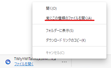 この場合は、「・・・」の部分をクリックし、表示されるメニューから「この種類のファイルは常に開く」をクリックします(赤線部分)。